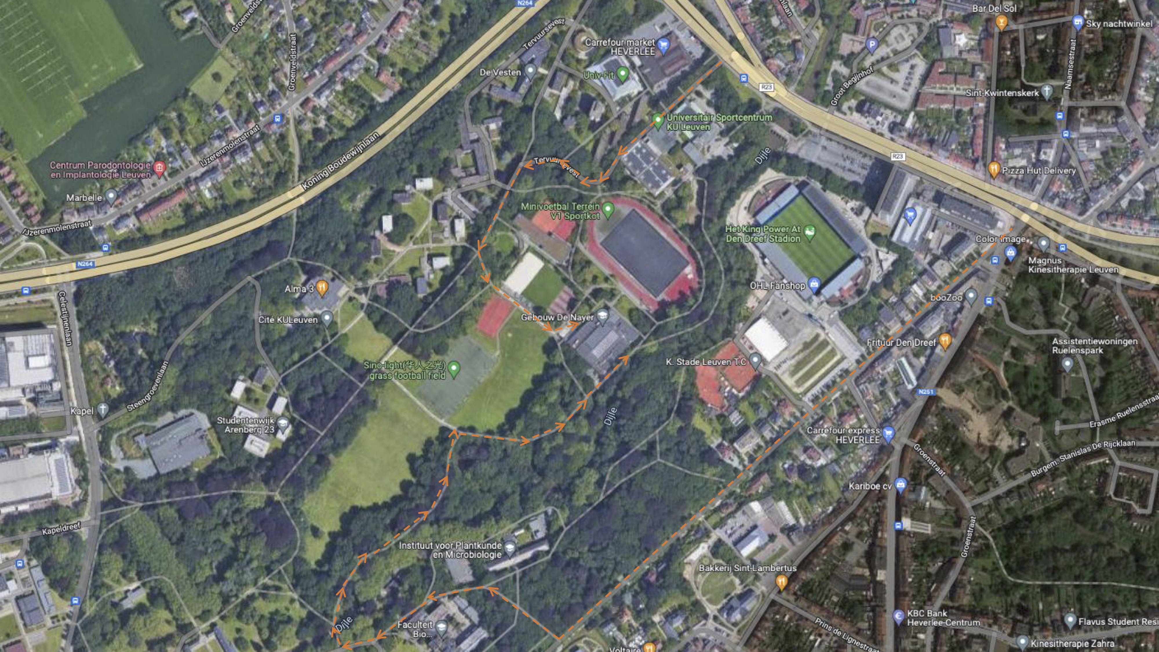 Het niet zo eenvoudig om het Universitair Sportcentrum (Sportkot) in Leuven te bereiken. Van het Sportsecretariaat van de KUleuven kregen we dit kaartje, dat waarschijnlijk een hulp kan zijn. De mogelijkheden om het gebouw De Nayer te bereiken zijn aangegeven in oranje stippellijn met pijltjes voor de richting.