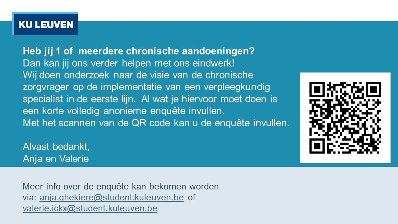 Dit keer gaat het om een enquête om de visie van chronische zorgvragers te bestuderen ivm de implementatie van verpleegkundig specialist in de eerstelijnszorg/huisartsenpraktijk. Deze enquête is volledig anoniem.